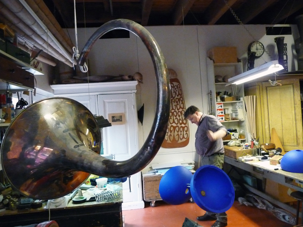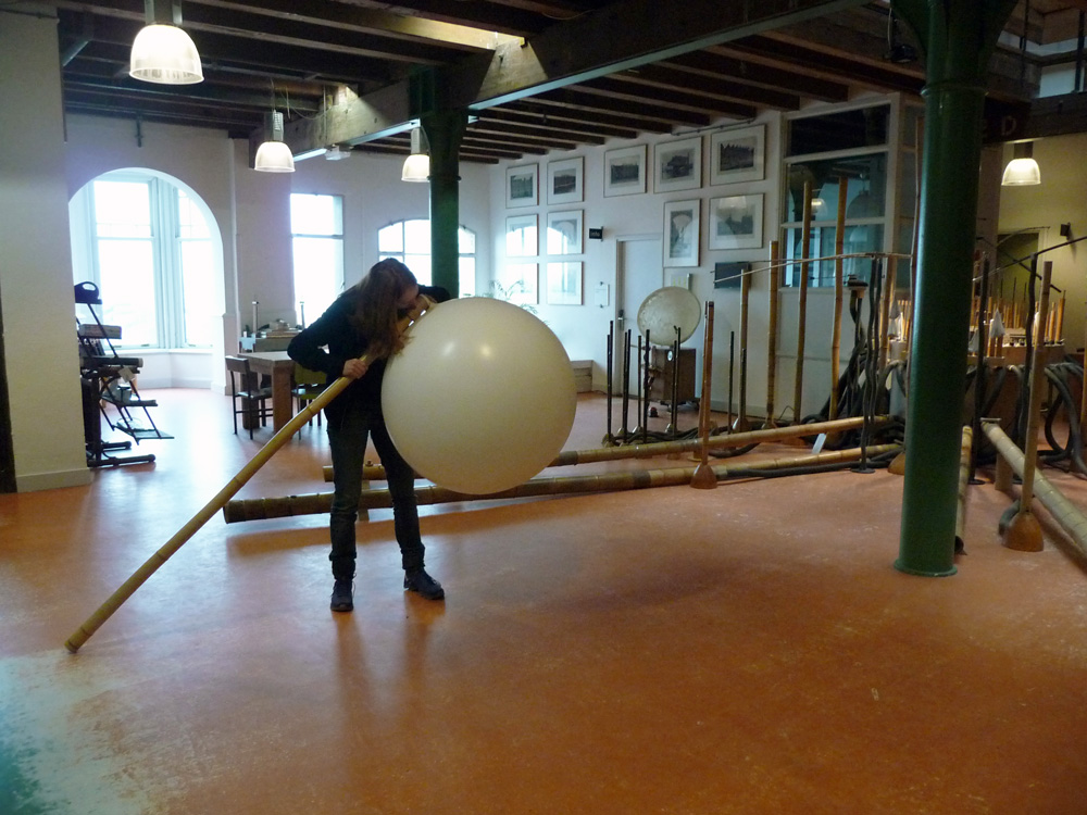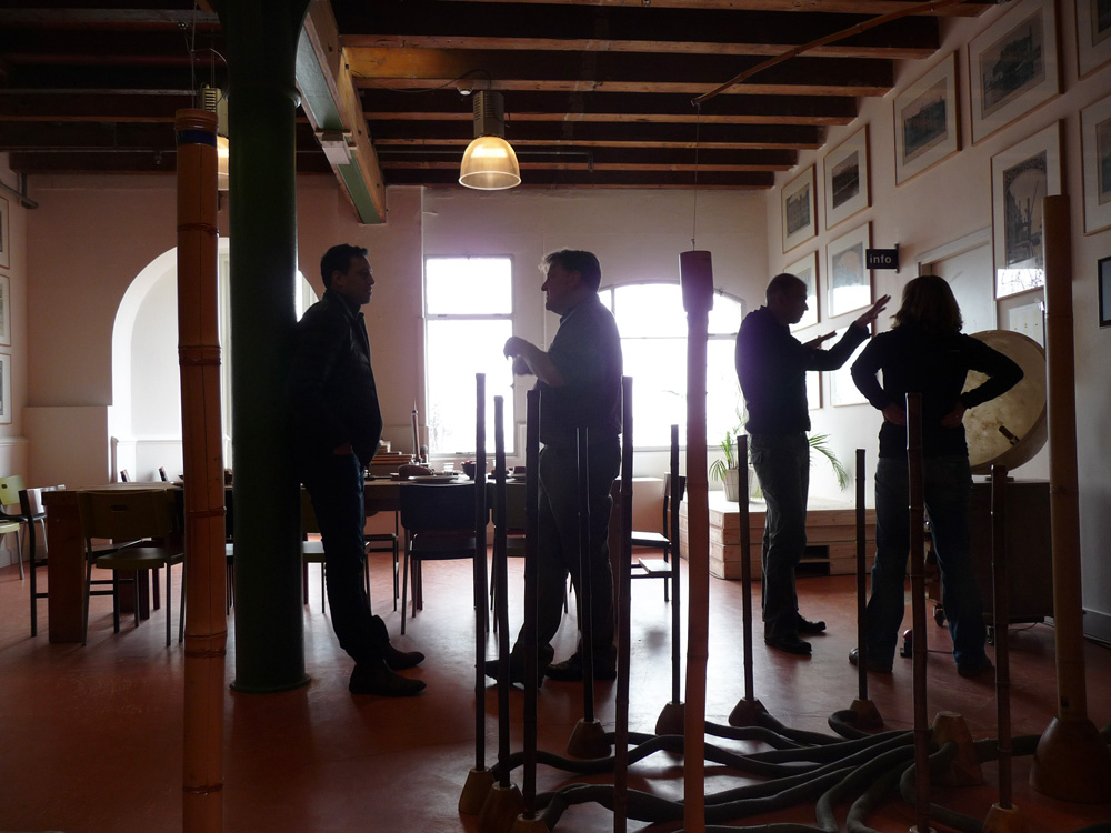 The project team is back from an intense weekend in Amsterdam: we visited Hans‘ atelier, made the first try-outs and drafted the outlines towards a prototype of a stage-size sounding sculpture. Sound has never felt so tangible!